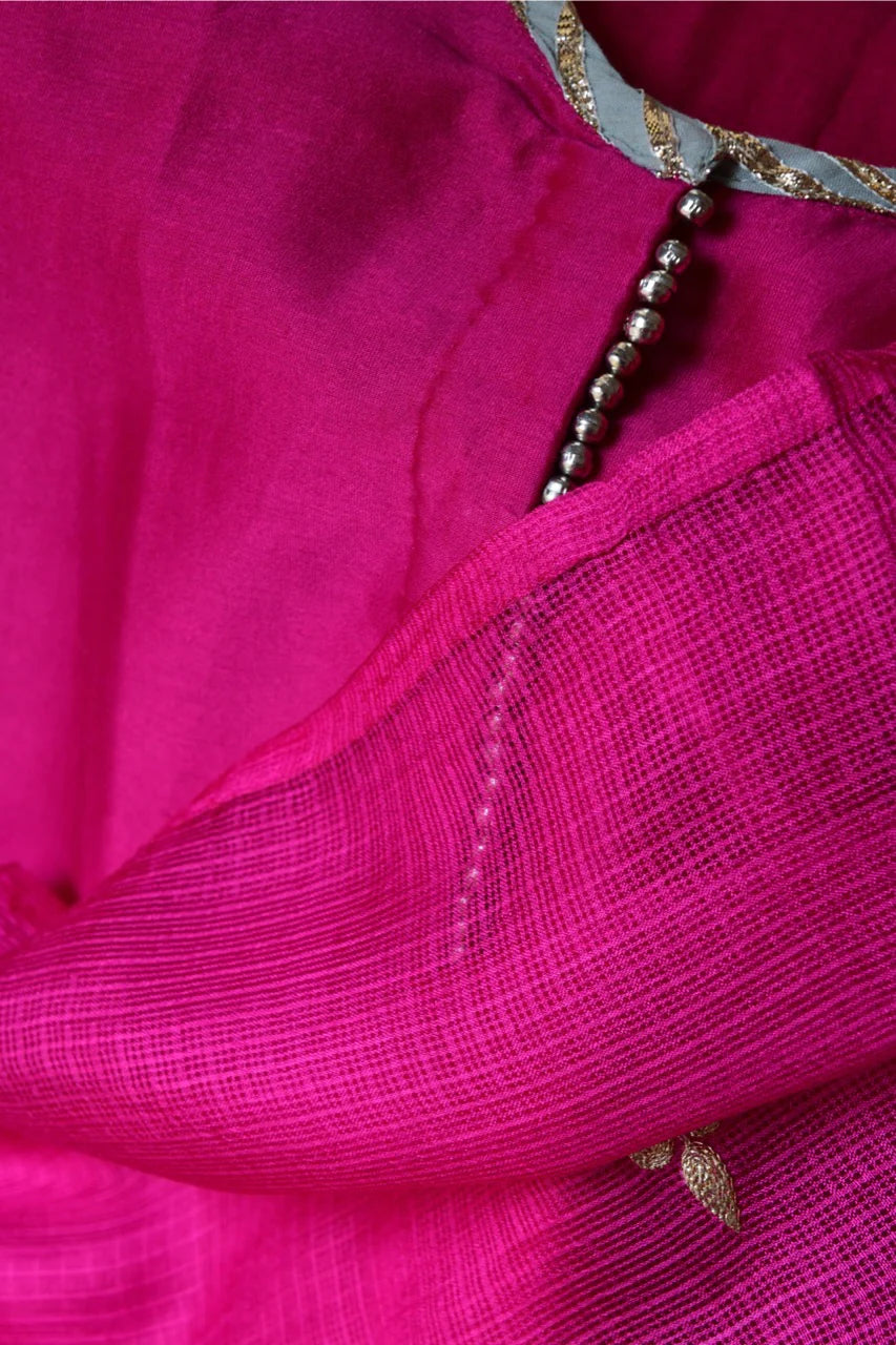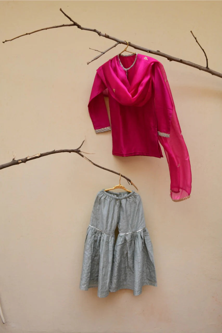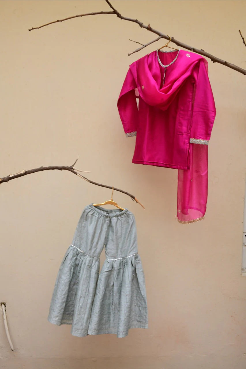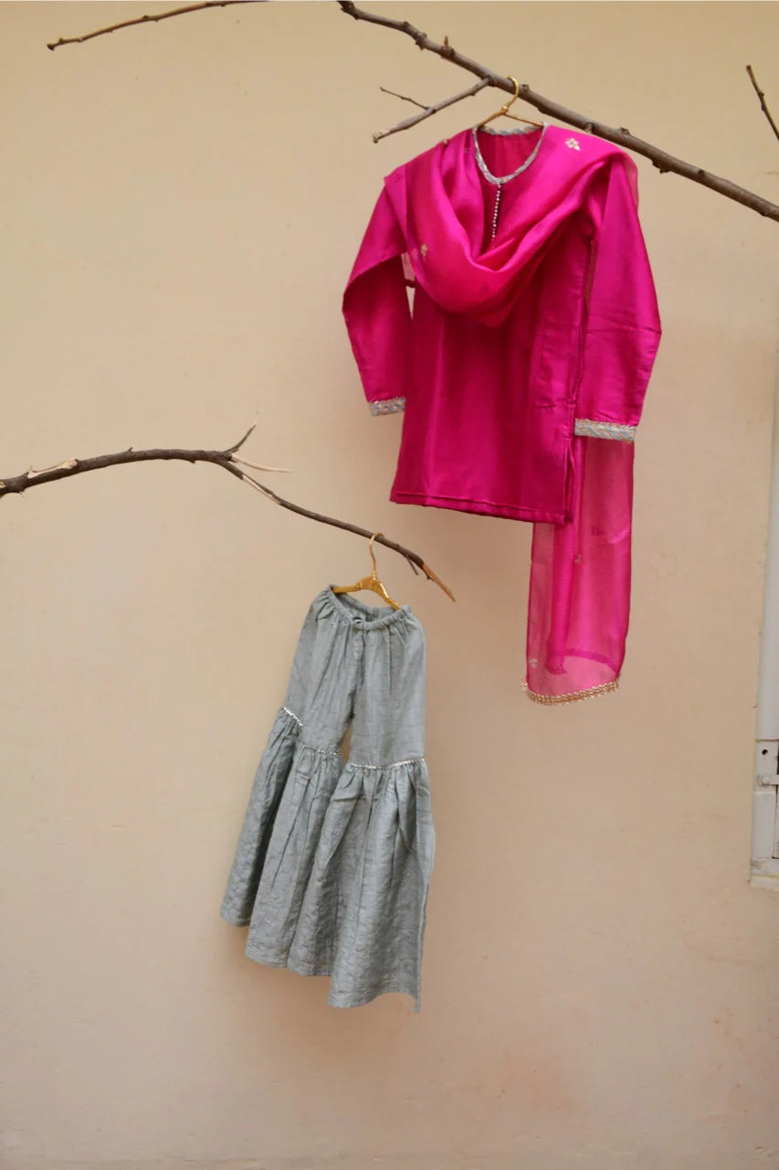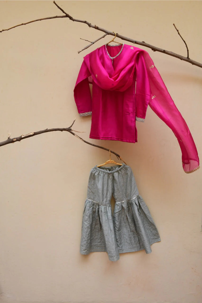 Chanderi long kurta with hand hemmed ghungroo placate and Gota magzi on sleeves and neckline, chanderi checks Sharara, dupatta is handspun kota silk embellished with small bootis done by our in-house artisans with sari and dabka work.