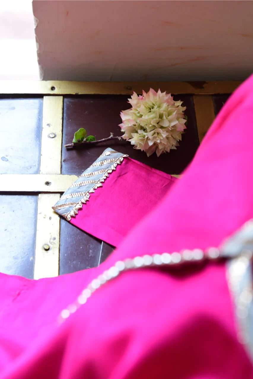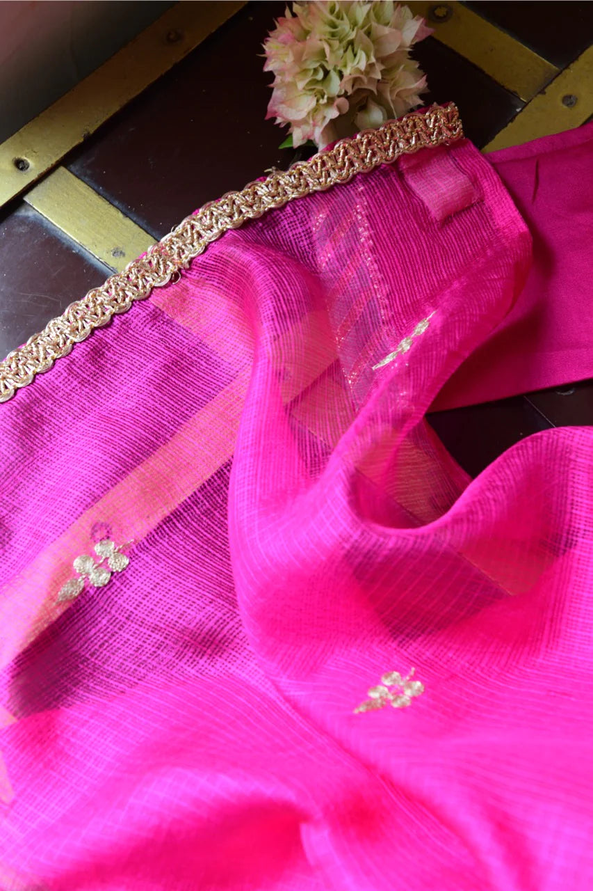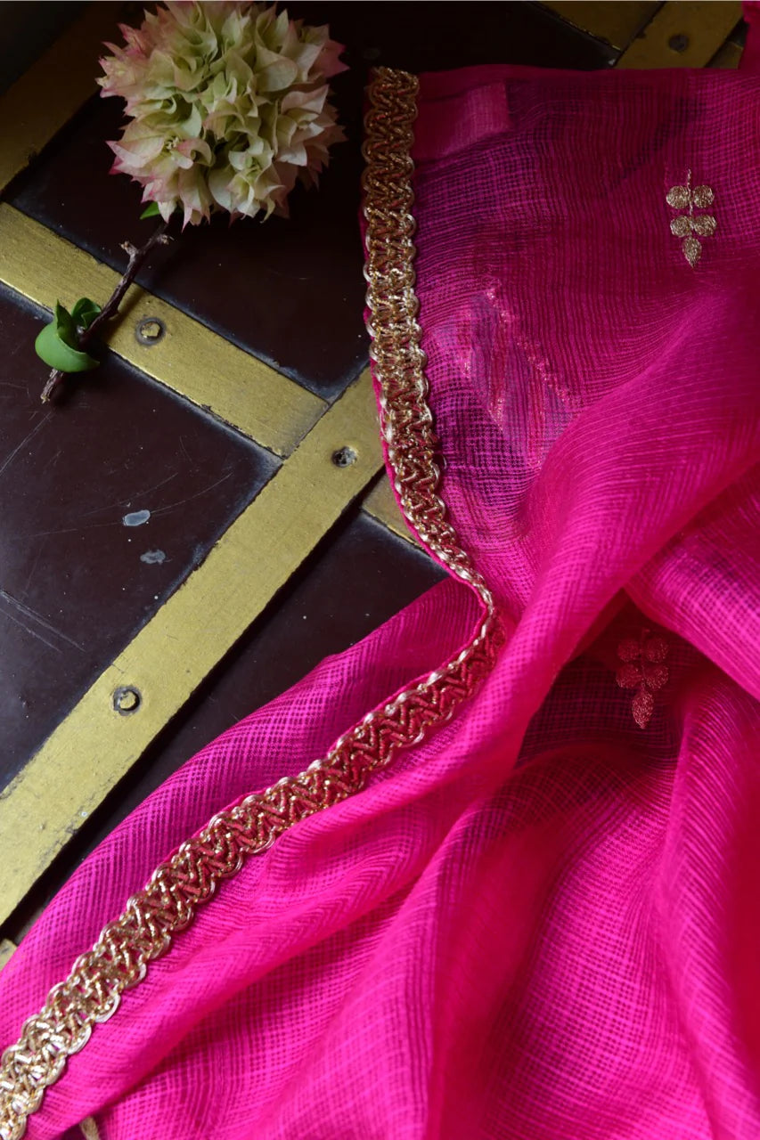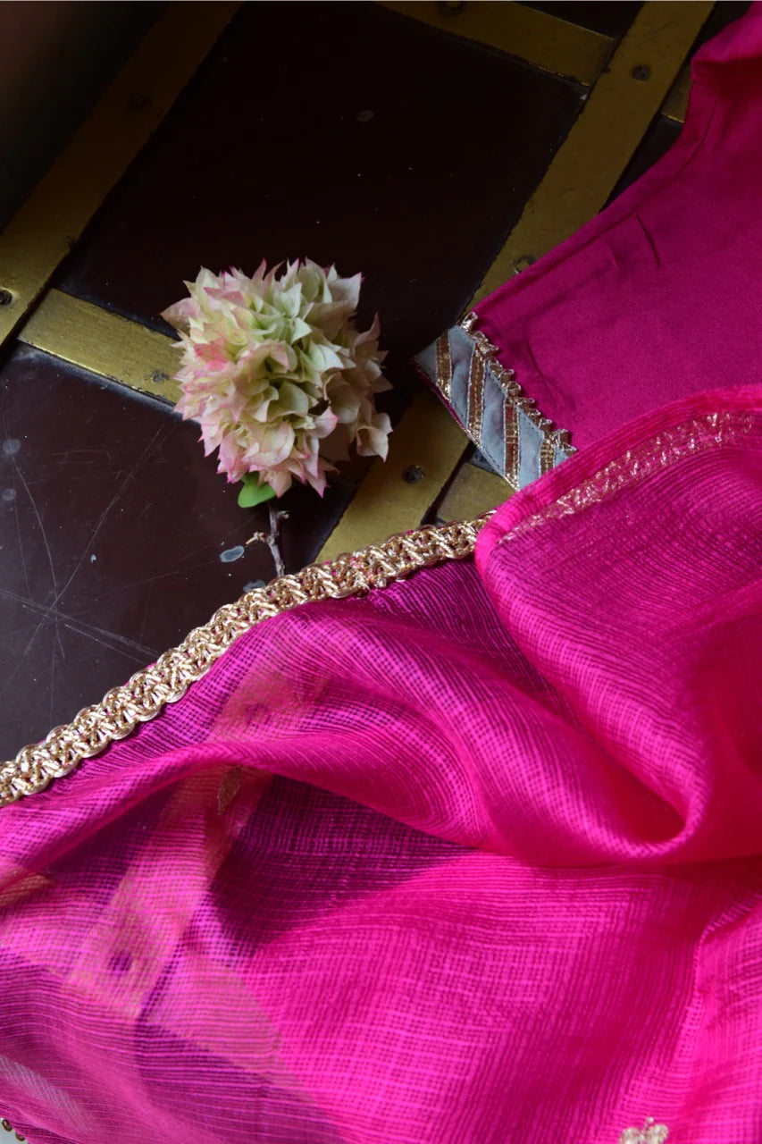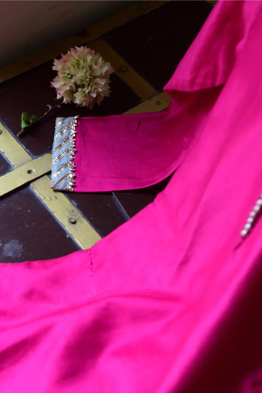 Chanderi long kurta with hand hemmed ghungroo placate and Gota magzi on sleeves and neckline, chanderi checks Sharara, dupatta is handspun kota silk embellished with small bootis done by our in-house artisans with sari and dabka work.